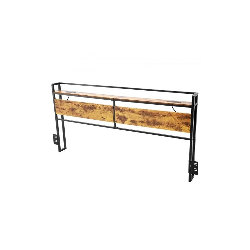 Sängynpääty leveälle sängylle ruskeat puupaneelit mustalla metallirungolla integroidulla virtapaneelilla