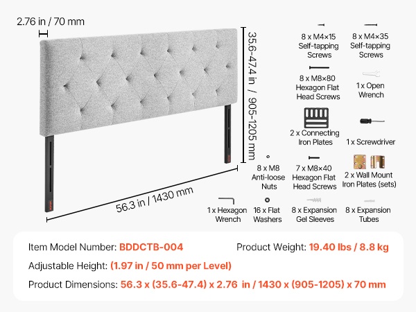 Päädyn korkeutta voi säätää 1.97 tuuman / 50 mm askelin välillä 35.6–47.4 tuumaa, joten se on helppo sovittaa eri runko- ja patjakorkeuksiin ilman yhteensopivuusongelmia.