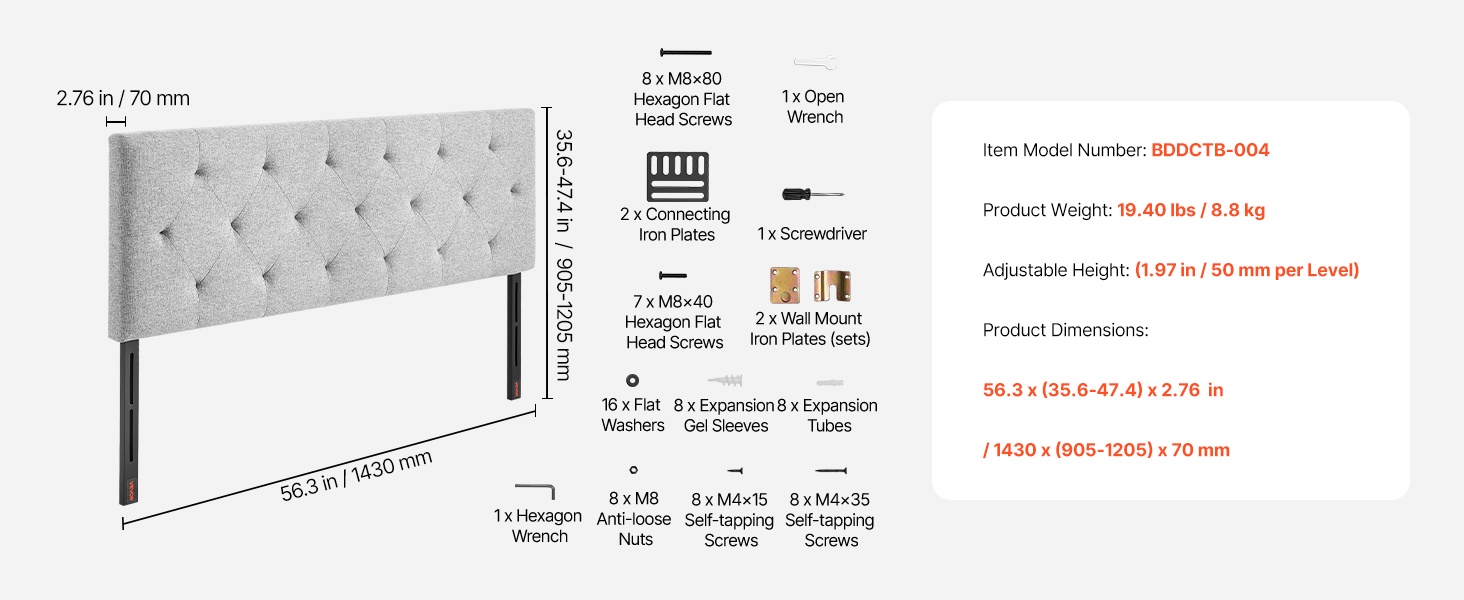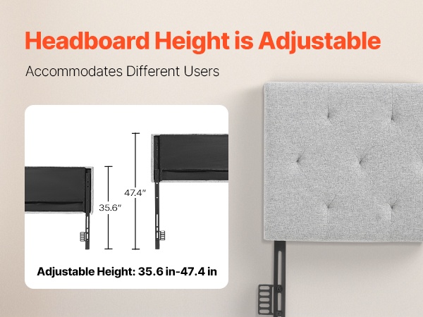 - Korkeus säädettävissä välillä 35.6–47.4 tuumaa, jotta pääty on helppo sovittaa erilaisiin sängyn ja patjan korkeuksiin