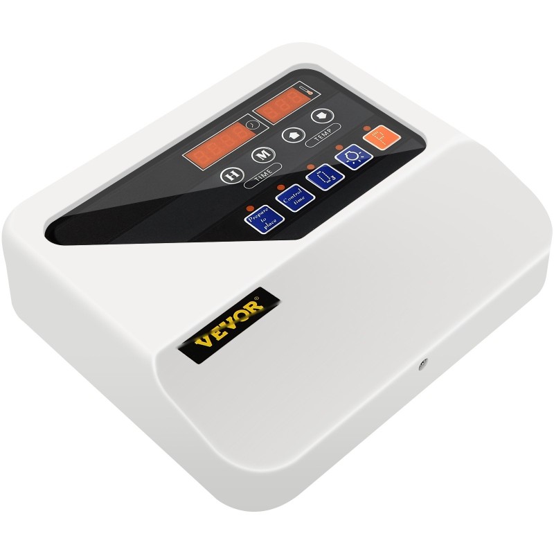 Ohjaimessa on selkeä näyttö ja painikkeet, joiden avulla lämmitysaikaa ja lämpötilaa on helppo säätää. Visuaalinen näyttö helpottaa tilan ja asetusten tarkistamista yhdellä silmäyksellä.