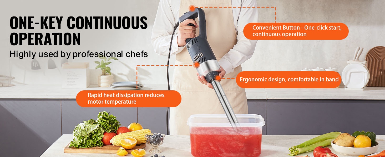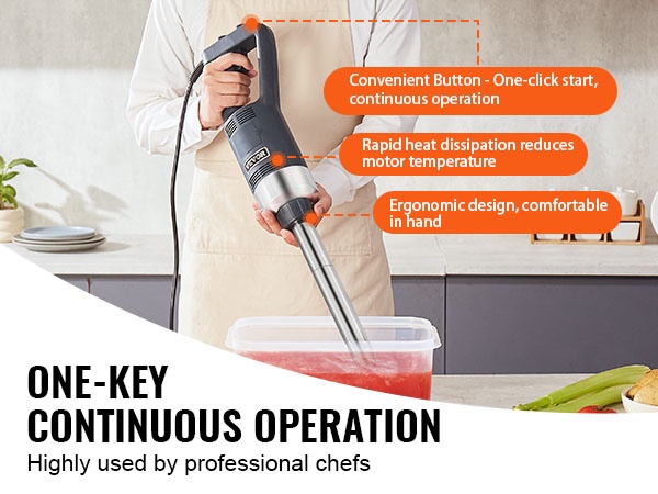 Yhden painikkeen pikakäynnistys tekee laitteen käytöstä suoraviivaista. Ergonominen muotoilu parantaa otetta ja käyttömukavuutta, mikä helpottaa pidempiaikaista työskentelyä ammattikeittiössä.