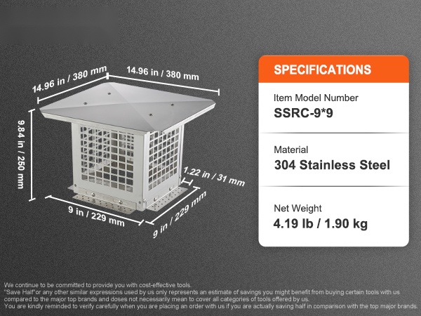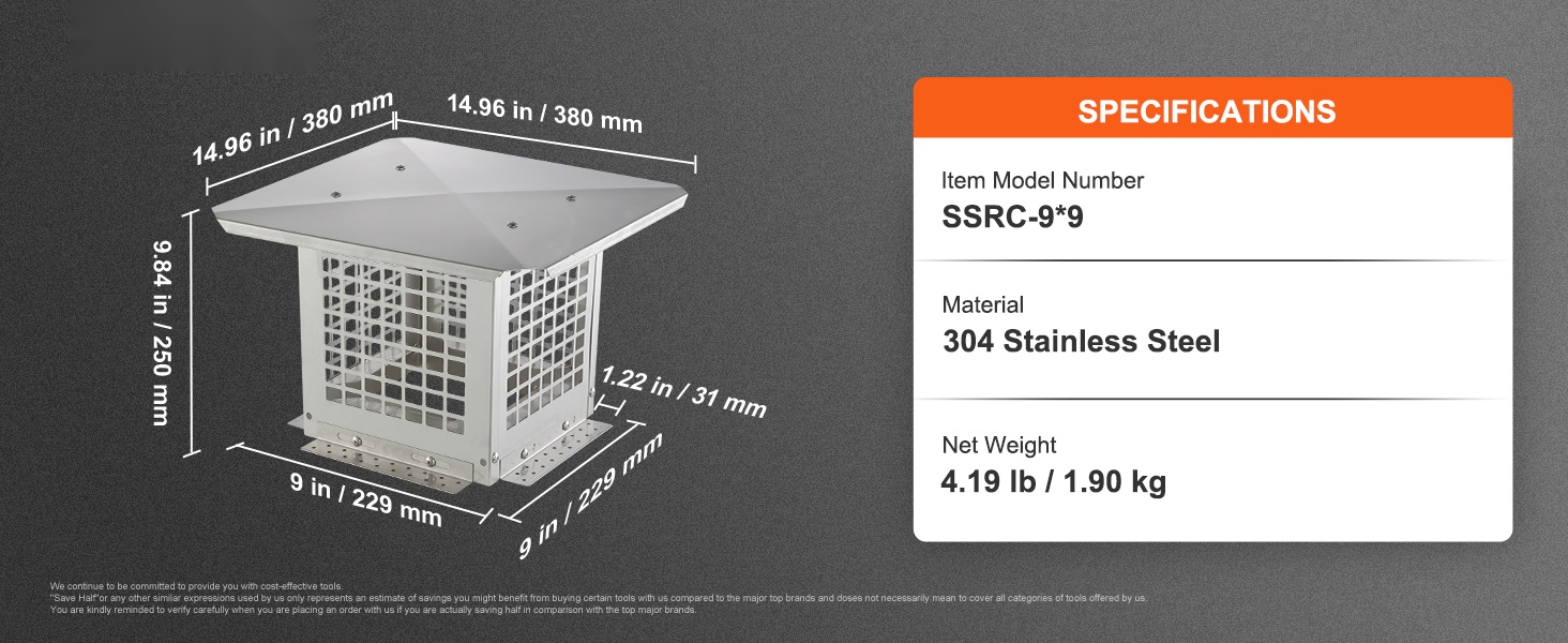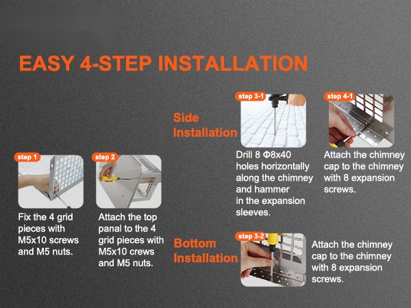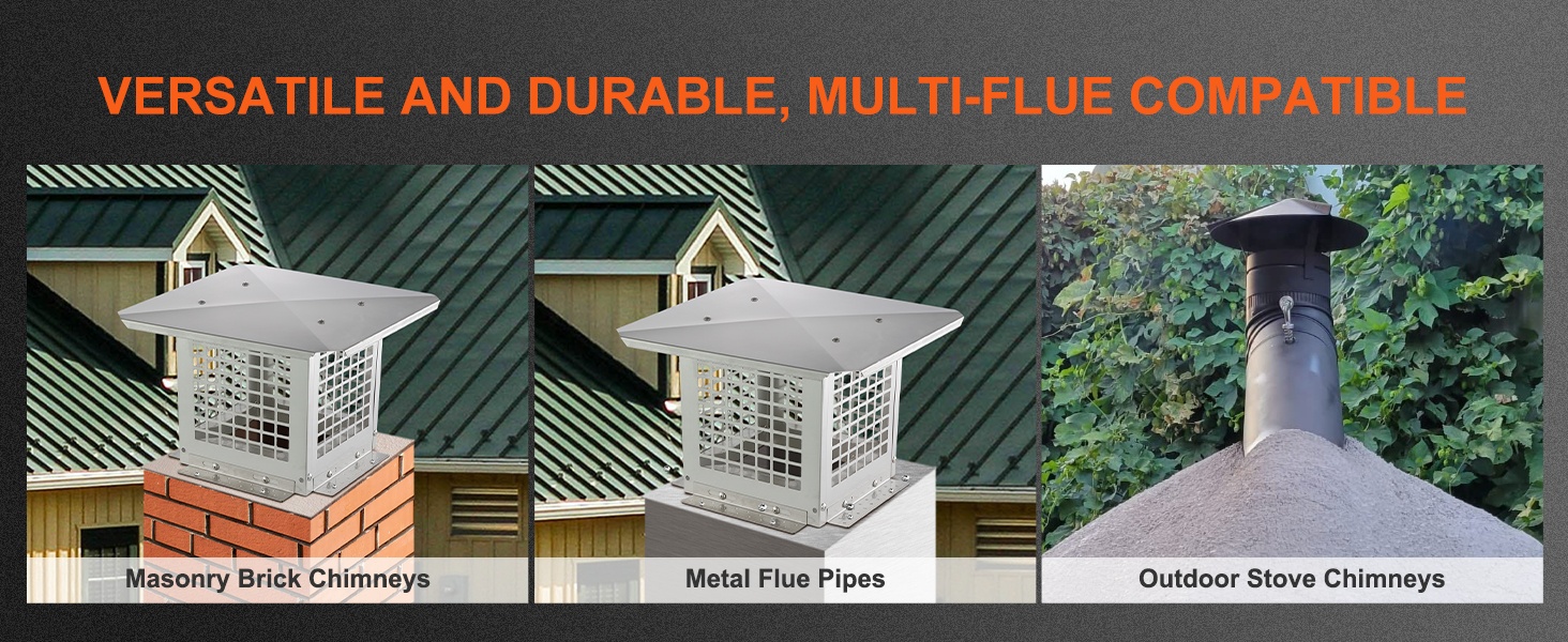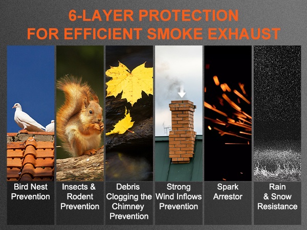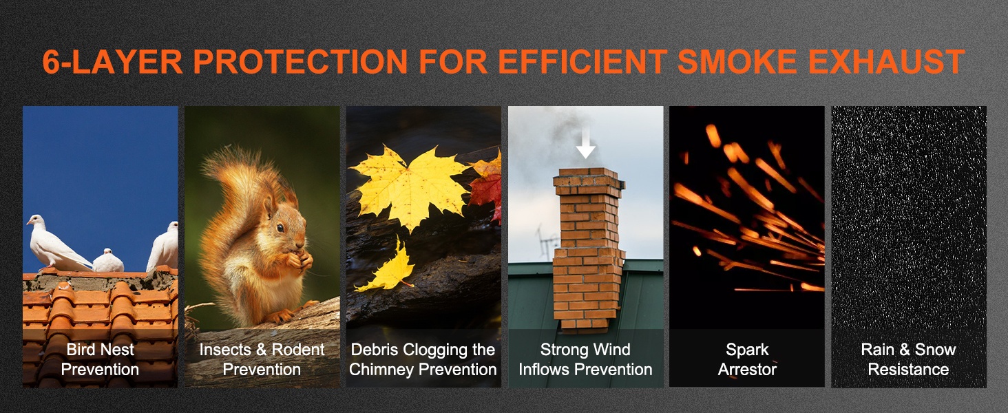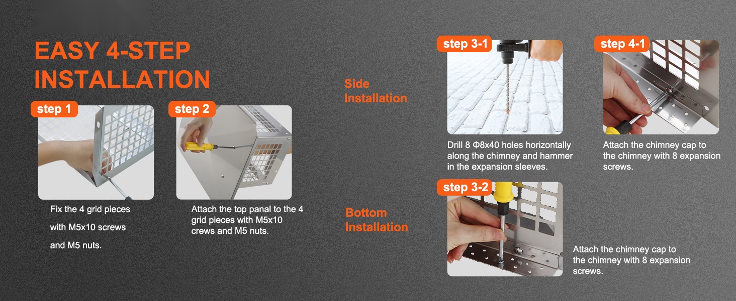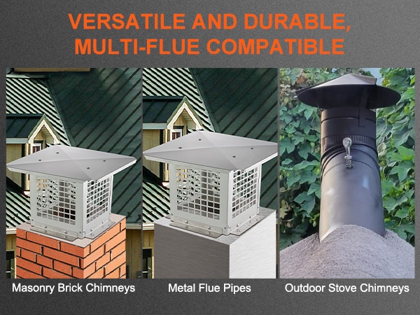 Tämä ruostumattomasta teräksestä valmistettu savupiipun hattu suojaa hormia sateelta, lumelta, roskilta ja eläimiltä. Se auttaa pitämään vedon tasaisena, ehkäisee kipinöiden lentämistä katolle ja pidentää savupiipun käyttöikää. Hattu sopii useisiin hormityyppeihin ja on helppo asentaa kahdella eri menetelmällä.