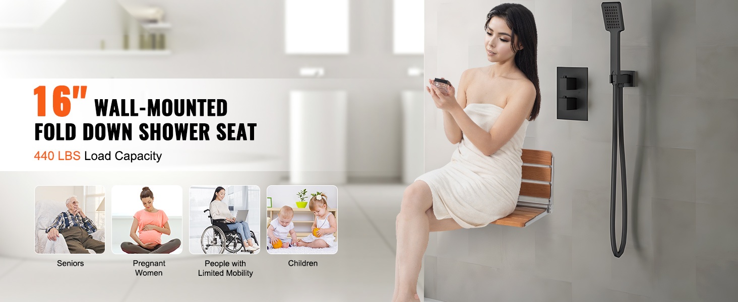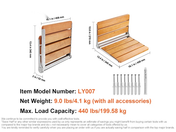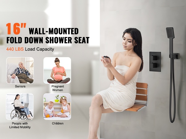Seinään kiinnitettävä taitettava teak-puinen suihkuistuin 20,9×16 tuumaa 226,8 kg kantavuus