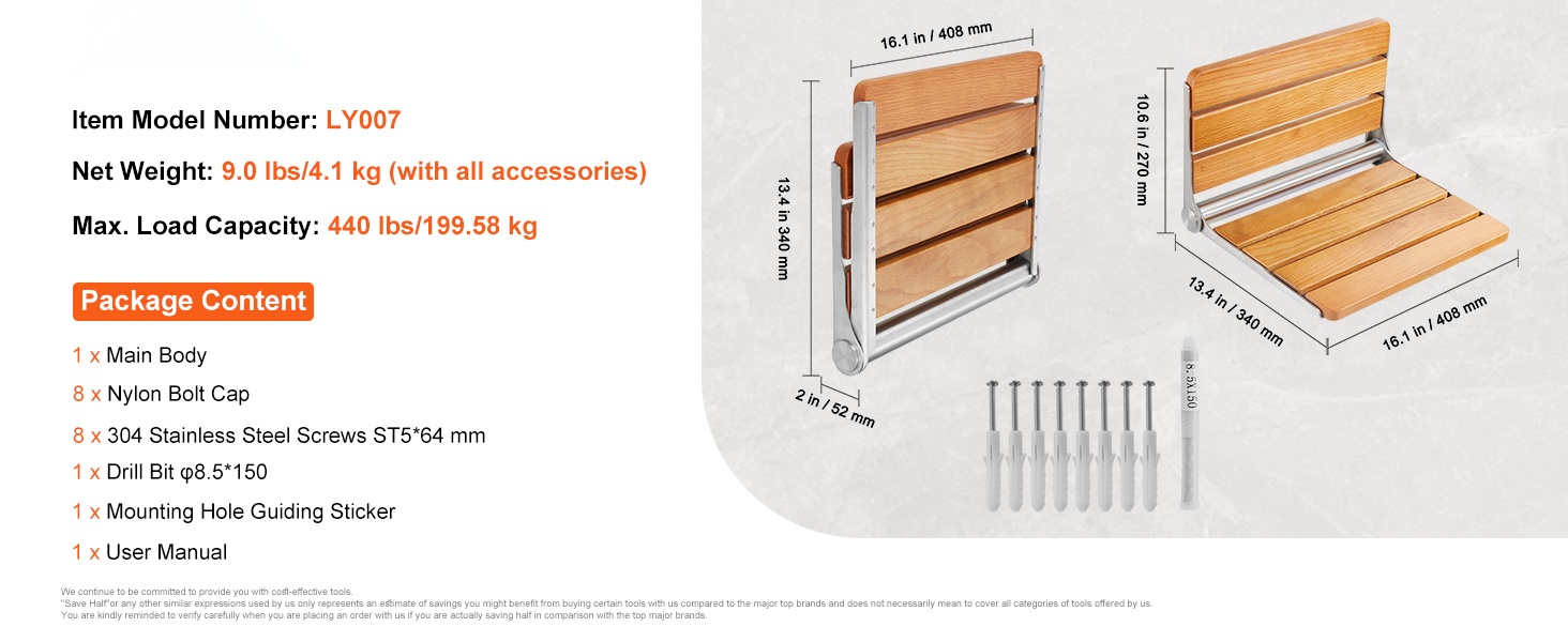 Istuin kiinnitetään seinään 304-ruostumattomasta teräksestä valmistetuilla ruuveilla, jotka parantavat kantavuutta ja kestävät ruostumista. Vahva rakenne tekee istuimesta luotettavan valinnan esimerkiksi senioreille, raskaana oleville, lapsille sekä liikuntarajoitteisille henkilöille.