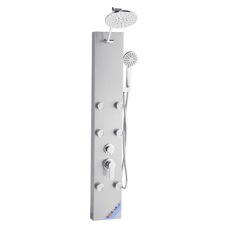 Tämä seinään asennettava suihkupaneelijärjestelmä tarjoaa kattavan ratkaisun kylpyhuoneen suihkualueen päivittämiseen. Yhdessä paneelissa on sadesuihku ylhäältä, käsisuihku sekä 6 vartalosuutinta miellyttäviä vesihierontoja varten. Harjattu ruostumaton teräs ja selkeä käyttölogiikka tekevät järjestelmästä helppohoitoisen ja käytännöllisen myös pienempiin tiloihin.