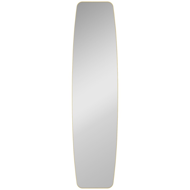 Kapea ja tilaa säästävä kokovartalopeili tuo eteiseen, makuuhuoneeseen tai olohuoneeseen valoa ja ryhtiä. Kultasävyinen metallikehys ja pehmeästi pyöristetyt kulmat luovat hillityn ylellisen ilmeen, ja kirkas lasi auttaa näkemään asun kokonaan päästä varpaisiin ennen ulos lähtöä.