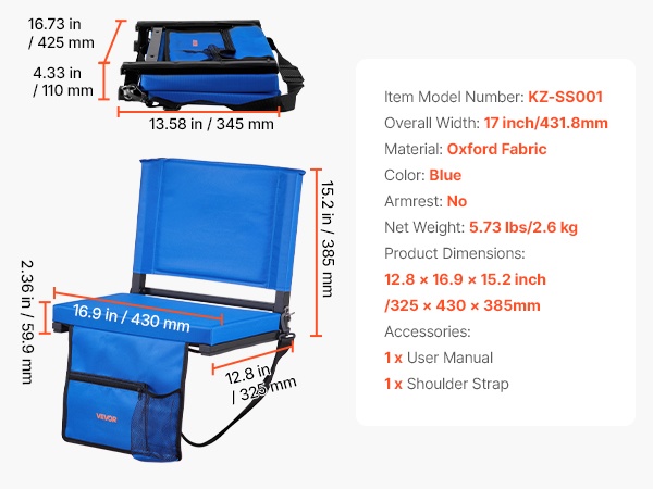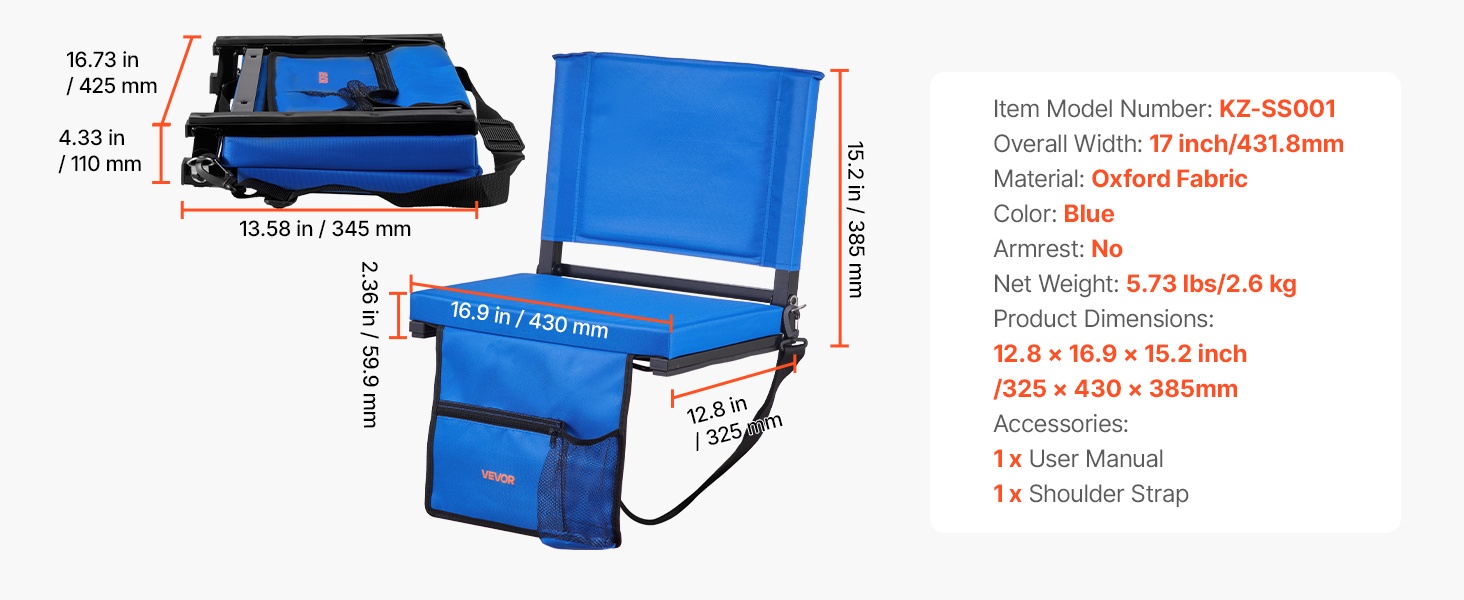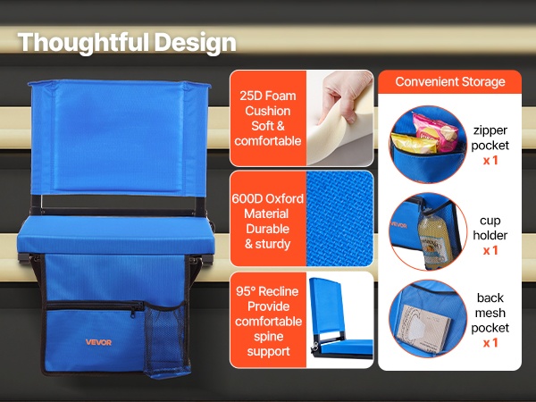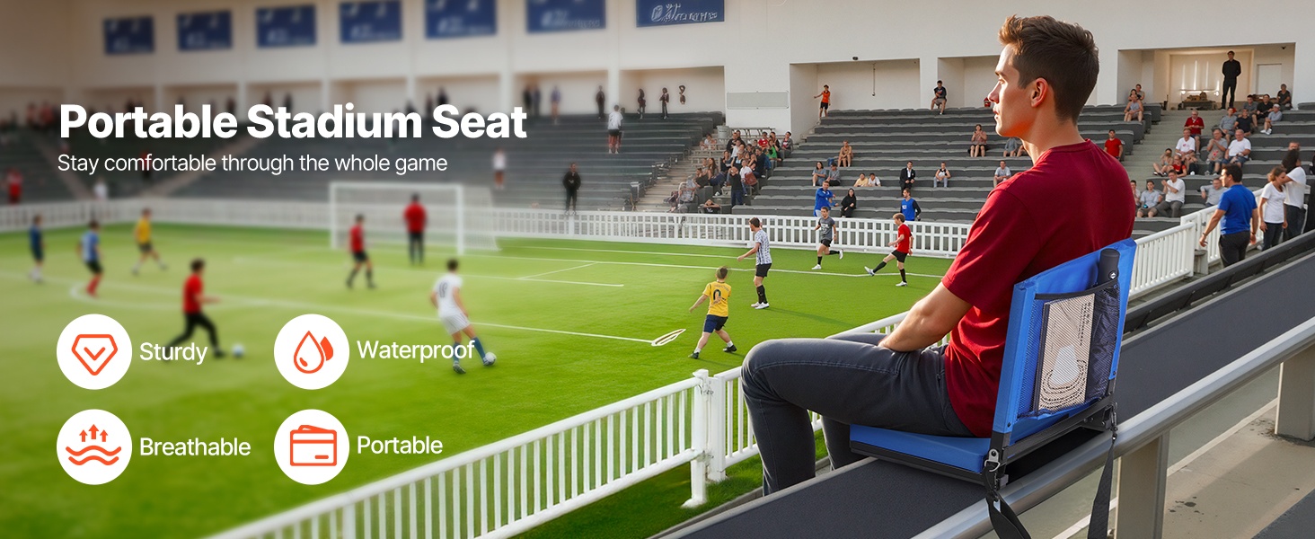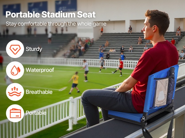 Selkänojallinen katsomoistuin auttaa pysymään mukavana peleissä ja konserteissa. Useat taskut pitävät puhelimen, juomat, naposteltavat ja nenäliinat käden ulottuvilla. Kevyt teräsrunko, tiheä vaahtopehmuste ja 600D vedenpitävä Lycra-kangas tuovat kestävyyttä ja helppokäyttöisyyttä ulkona.