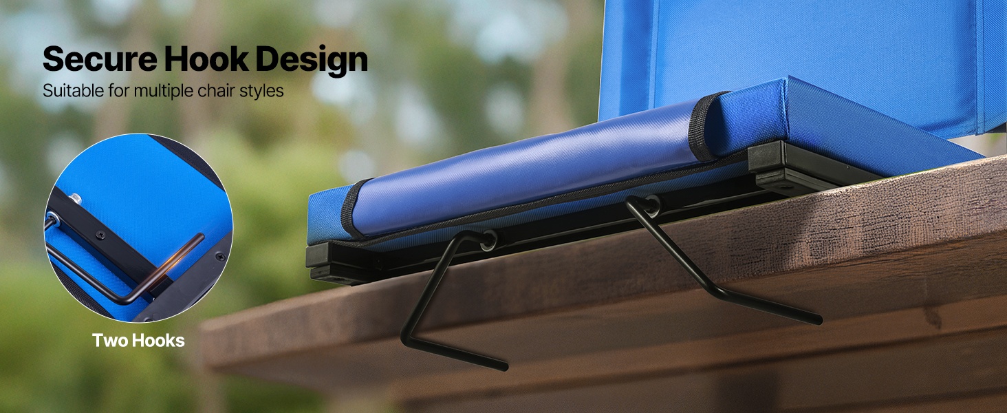 Istuin pysyy tukevasti paikallaan kahden istuimen alle sijoitetun ulosvedettävän koukun avulla. Koukut ankkuroidaan katsomopenkkiin, penkkiin tai tasaiselle maalle, mikä parantaa istumisen vakautta ja mahdollistaa nopean käyttöönoton erilaisissa tapahtumissa.