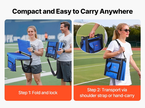 Selkänojallinen katsomoistuin taittuu puoliksi, joten se on helppo kantaa ja vie vain vähän tilaa auton tavaratilassa. Se sopii ulkoilmatapahtumiin, urheilukisoihin, konsertteihin, piknikeille ja puistoretkille. Kevyt rakenne tekee kuljettamisesta vaivatonta.