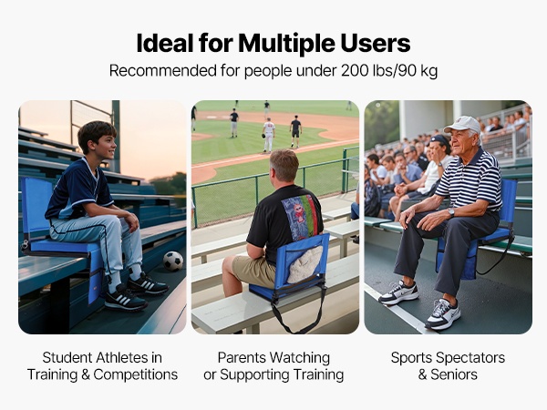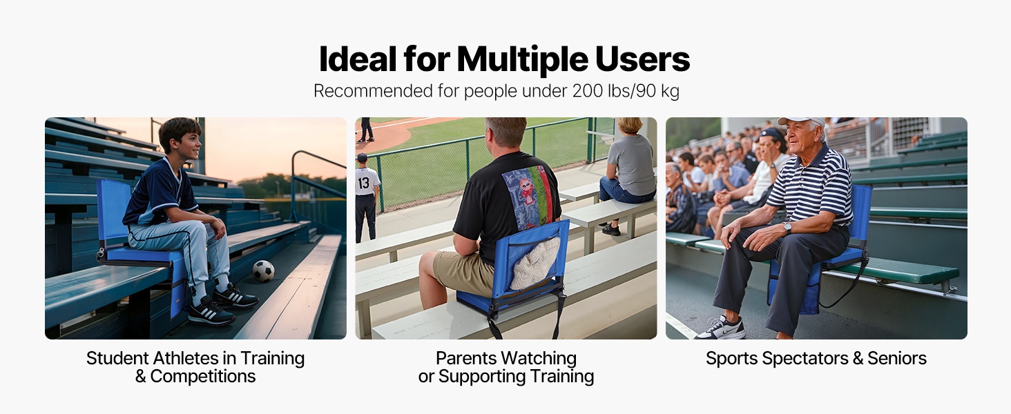 Taitettava katsomoistuin tarjoaa mukavan ja tukevan istumapaikan ulkoilmatapahtumiin. Se sopii hyvin urheilua seuraaville vanhemmille, opiskelijaurheilijoille, katsojille ja iäkkäämmille käyttäjille. Paksu pehmuste ja selkänoja helpottavat pitkää istumista kovilla penkeillä.