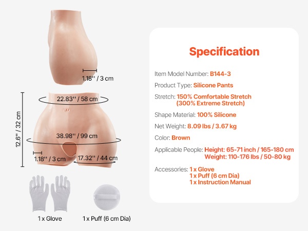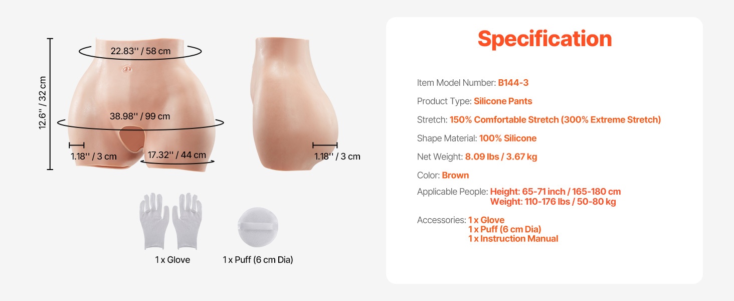 Nämä 100 % silikonista valmistetut lantiota korostavat housut yhdistävät mukavuuden ja luonnollisen ulkonäön. Pehmeä, iholle miellyttävä materiaali ja erinomainen joustavuus tekevät niistä sopivat esimerkiksi cosplayhin, drag-esityksiin sekä elokuva- ja TV-tuotantoihin. Muotoilevalla lantiohousulla viimeistelet siluettisi hillitysti ja huomaamattomasti.