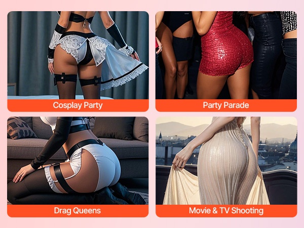 Housut sopivat esimerkiksi cosplay-tapahtumiin, paraateihin, drag-esiintymisiin sekä elokuva- ja TV-kuvauksiin. Realistinen ulkonäkö ja käyttömukavuus auttavat luomaan halutun hahmon ja linjakkaan vartaloprofiilin eri tilanteisiin.