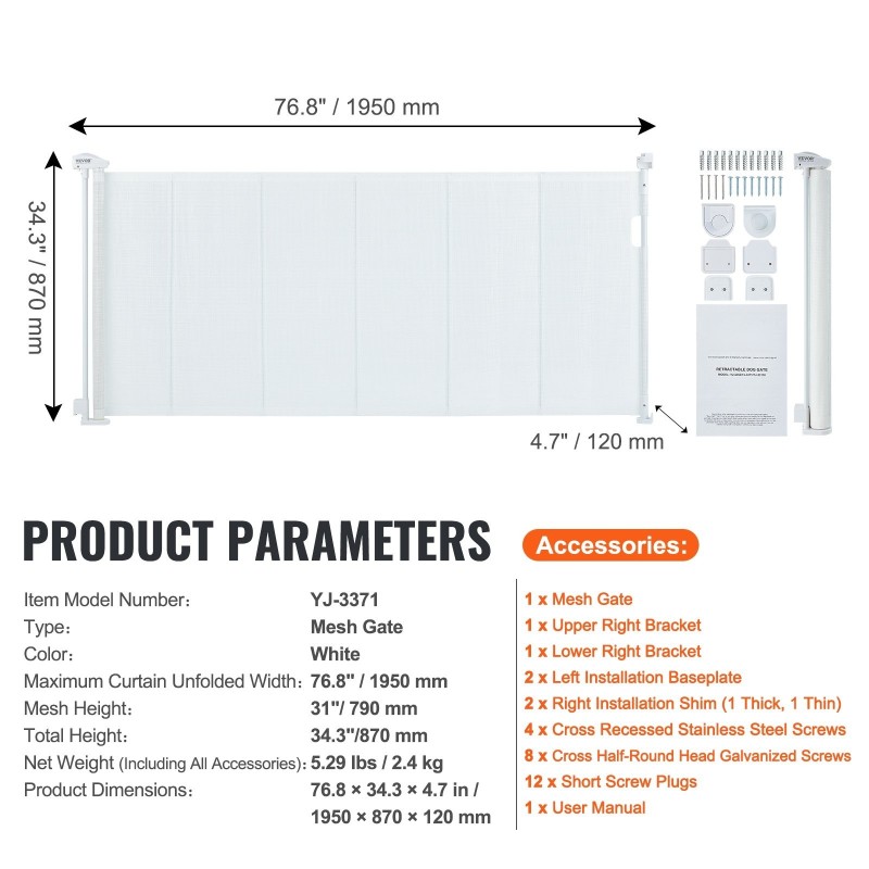- Korkea turvaportti: verkkokorkeus 31" / 790±8mm, kokonaiskorkeus 34.2" / 870±8mm