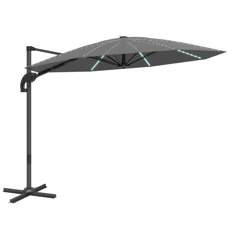 Tämä suuri, halkaisijaltaan 3 m:n sivuvarjo luo runsaasti varjoa terassille, pihalle tai parvekkeelle ja tuo iltoihin tunnelmavaloa integroiduilla LED-valoketjuilla. Korkeussäädettävä, kääntyvä ja kallistettava rakenne tekee auringonsuojasta helppoa koko päivän ajan, ja jalustaan tukeutuvat alumiinirunko ja lasikuituvanteet varmistavat vakaan käytön. Aurinkokennolla toimiva valaistus ja kankaan UPF 50+ -aurinkosuoja tekevät tästä varjosta käytännöllisen ratkaisun ulkotilaan keväästä syksyyn.