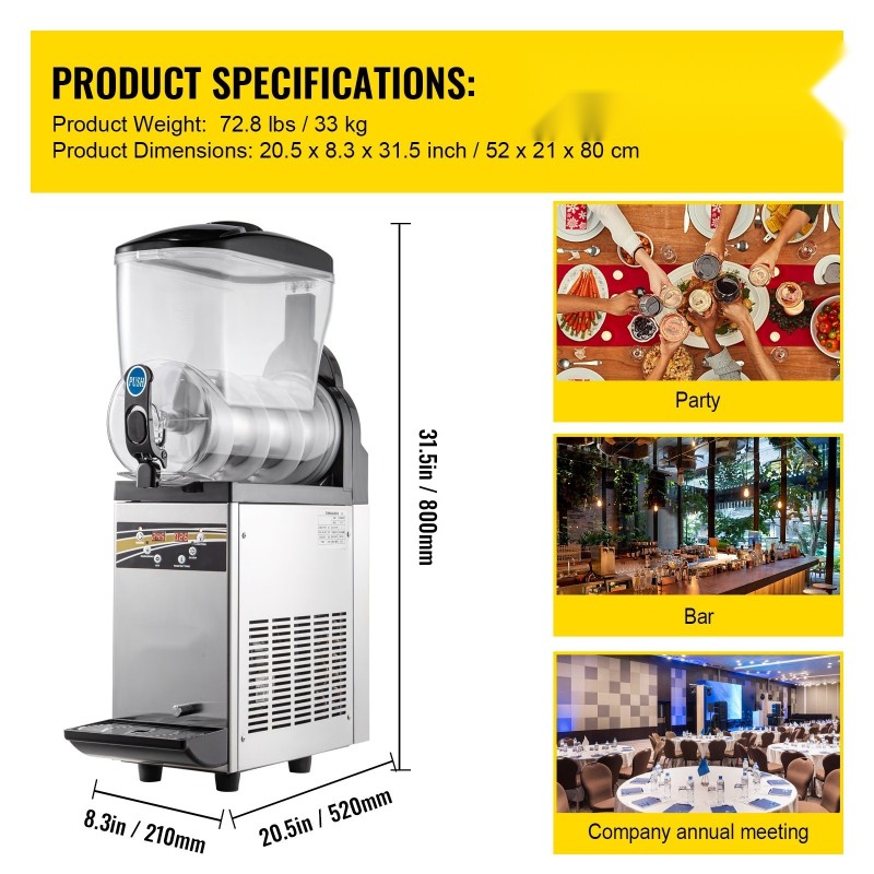 Tämä ammattikäyttöön tarkoitettu slush-juomakone on varustettu 15L / 3.96 Gal säiliöllä, jolla valmistat kerralla noin 60 kupillista jääjuomia (suositeltu sokeripitoisuus noin 13 %, alkoholipitoisuus alle 13 %). Suuri kapasiteetti vähentää täyttötarvetta, ja läpinäkyvä säiliö esittelee juomat selkeästi. Sopii esimerkiksi jäätelöbaareihin, hampurilaisravintoloihin, kahviloihin, baareihin ja erilaisiin tapahtumiin.