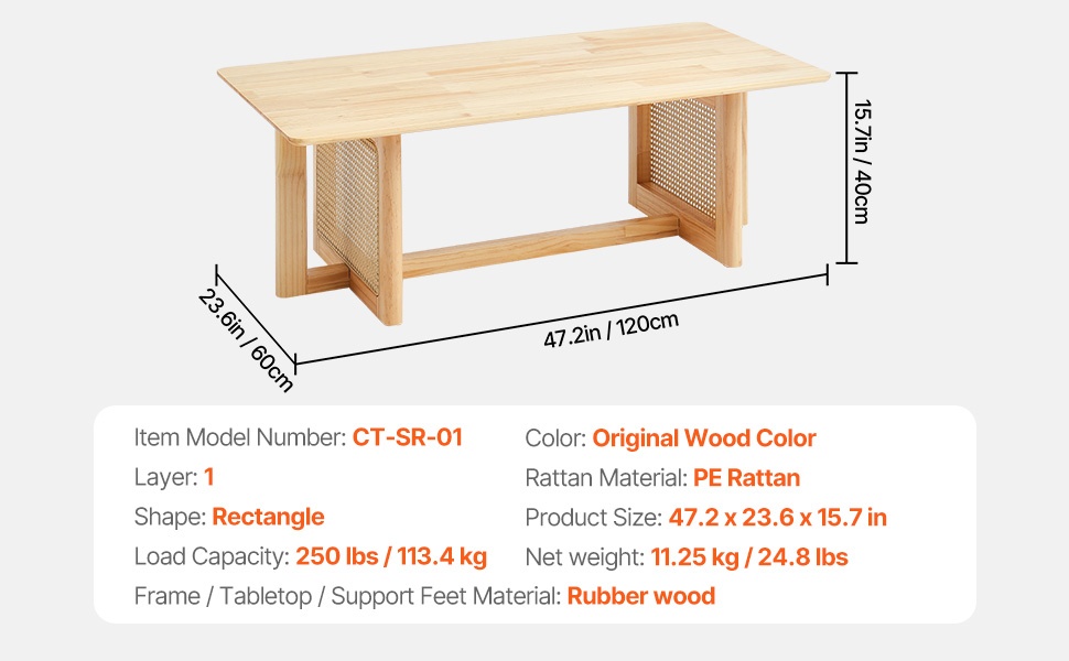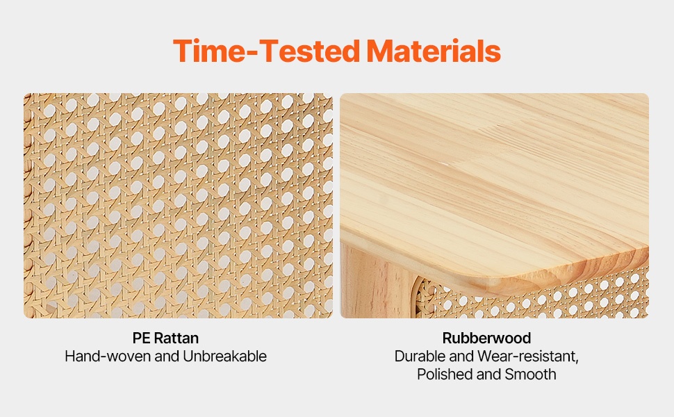 Pöytä on valmistettu MDF-levystä ja kestävästä PE-rottingista. Pöydän kansi kestää enintään 80 lbs / 36.3 kg ja alaosasto 60 lbs / 27.2 kg, mikä tekee pöydästä tukevan ja sopivan jokapäiväiseen käyttöön.