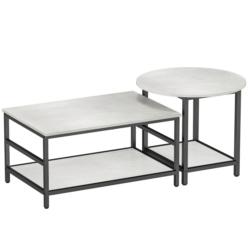 Sohvapöytäsarja olohuoneeseen, 2 kpl, teräs ja marmorikuvioitu levy, musta/valkoinen