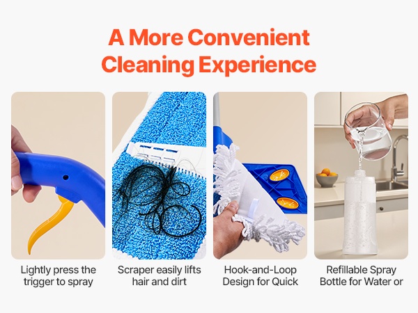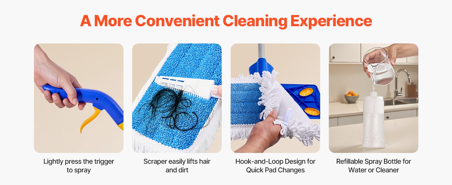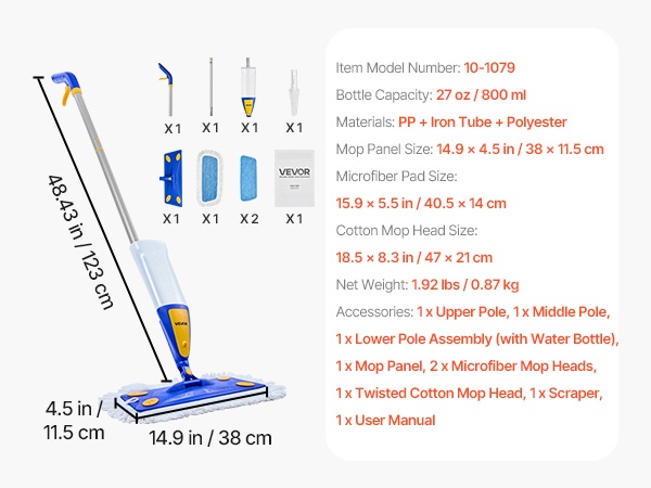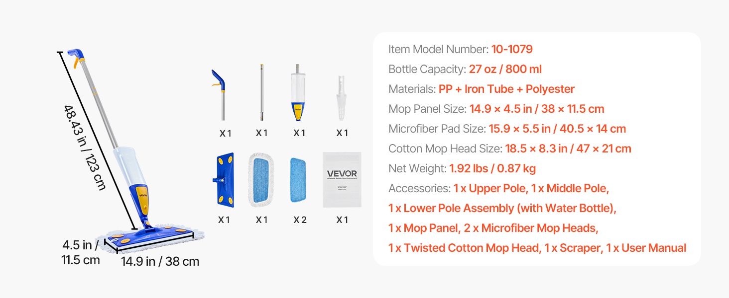 - Pakkauksen sisältö: spray-moppi, 1 puuvillapadi, 2 mikrokuitupadia, kaavin