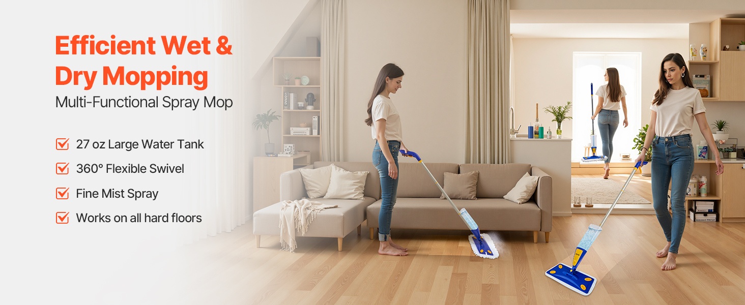 Kätevä spray-moppi yhdistää kuiva- ja märkäpuhdistuksen yhteen välineeseen. Suuri 27 oz / 800 ml uudelleentäytettävä vesisäiliö, pitkä ja mukava varsi sekä 360° kääntyvä mopin pää helpottavat siivousta. Mukana tulevan kaapimen avulla lika ja pöly irtoavat tehokkaasti ilman turhaa vaivaa.