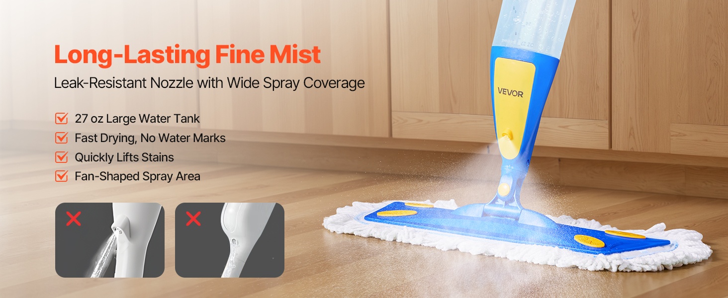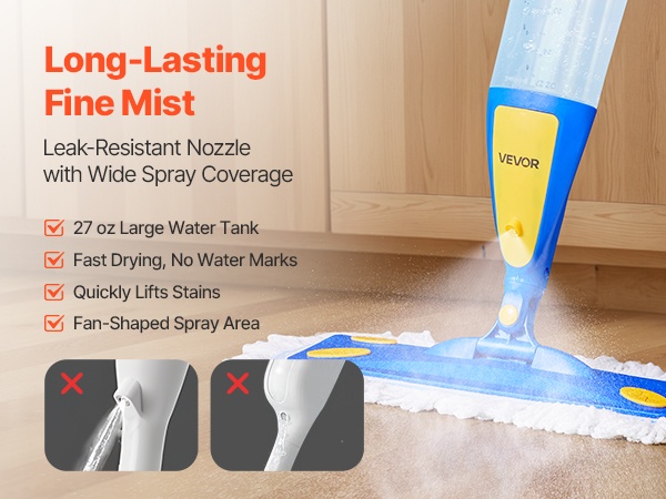 Ultraohut suutin levittää laajan ja tasaisen sumun, joka kosteuttaa lattian vain kevyesti. Vuotosuojattu rakenne auttaa ehkäisemään vesilammikoita ja raitoja, joten lattiat kuivuvat nopeasti eivätkä tunnu tahmeilta. Kevyt kosteus kerää tehokkaasti pölyä ja likaa ja on hellävarainen lattioille.