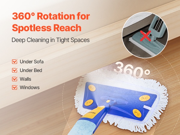 Joustava, 360° kääntyvä mopin pää helpottaa siivoamista sohvien ja sänkyjen alta sekä seinänvierustoista ja nurkista. Näin vaikeasti tavoitettavat pöly- ja likakertymät saadaan pois ilman raskasta kalusteiden siirtelyä.