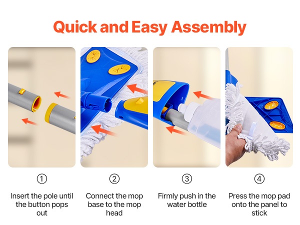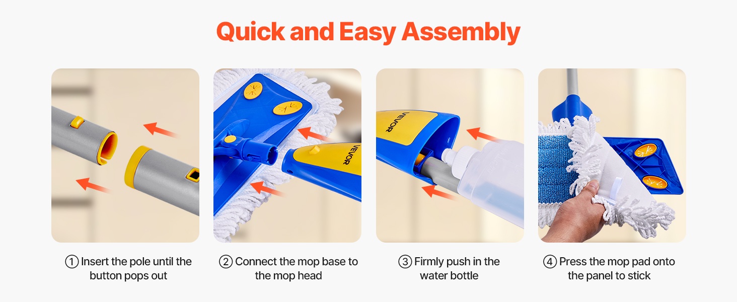 Moppi on helppo koota käyttövalmiiksi: työnnä varren osat yhteen, kunnes lukitusnappi napsahtaa paikoilleen, kiinnitä mopin pää paneeliin, aseta vesisäiliö tukevasti paikalleen ja paina mop-padi paneeliin kiinni.