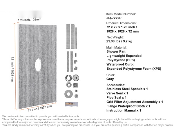 - Suihkun pohjalevyn päämateriaali: kevytrakenteinen laajennettu polystyreeni (EPS)