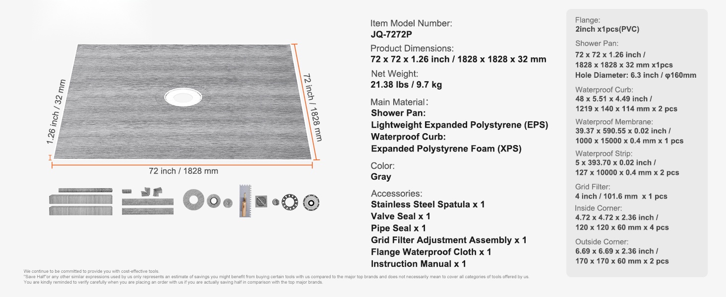 Suihkualustasarja EPS 1828x1828x32mm XPS-kynnys ABS-laippa 50,8mm ruostumaton ritilä 101,6mm