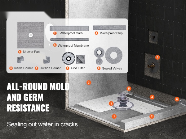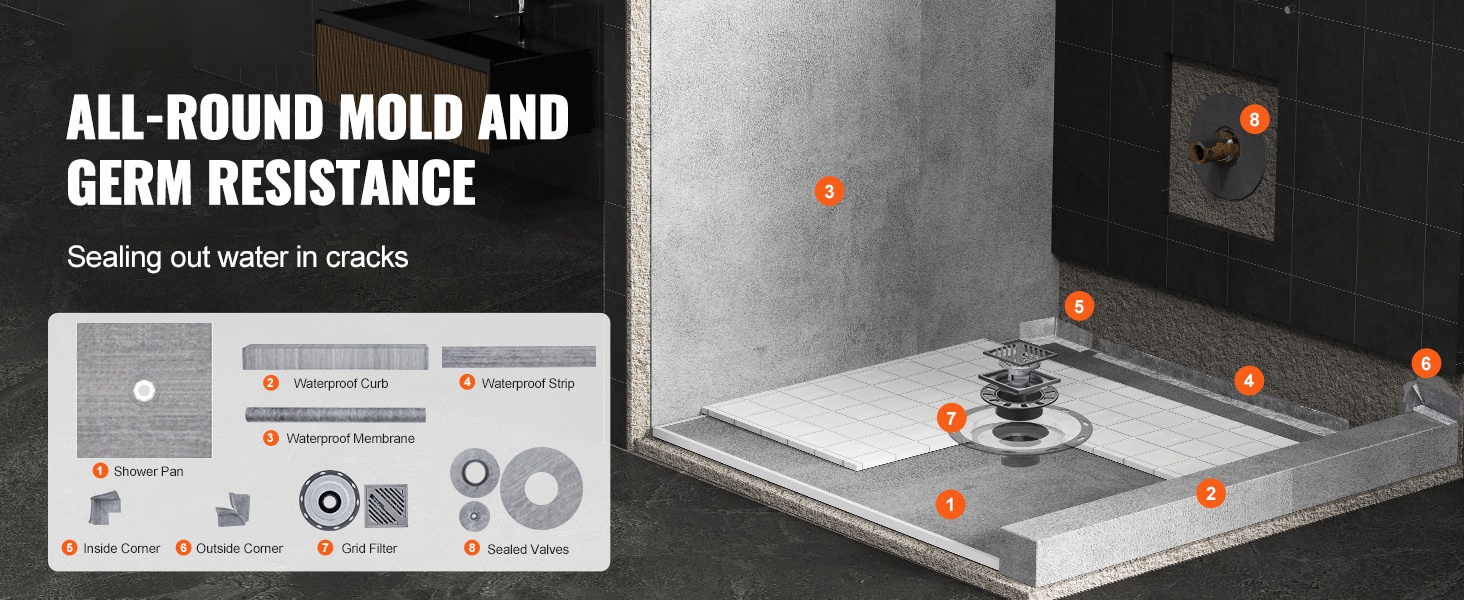 Pakkaus sisältää vedenpitävän kalvon, vedeneristysnauhat sekä sisä- ja ulkokulmakappaleet. Ne eristävät tehokkaasti saumat ja vuotokohdat. Kulmien harkittu muotoilu parantaa rakenteen kestävyyttä ja tarjoaa pitkäaikaisen suojan suihkutilalle.