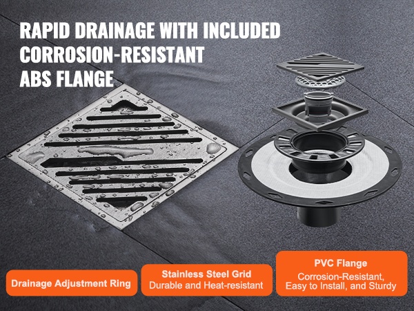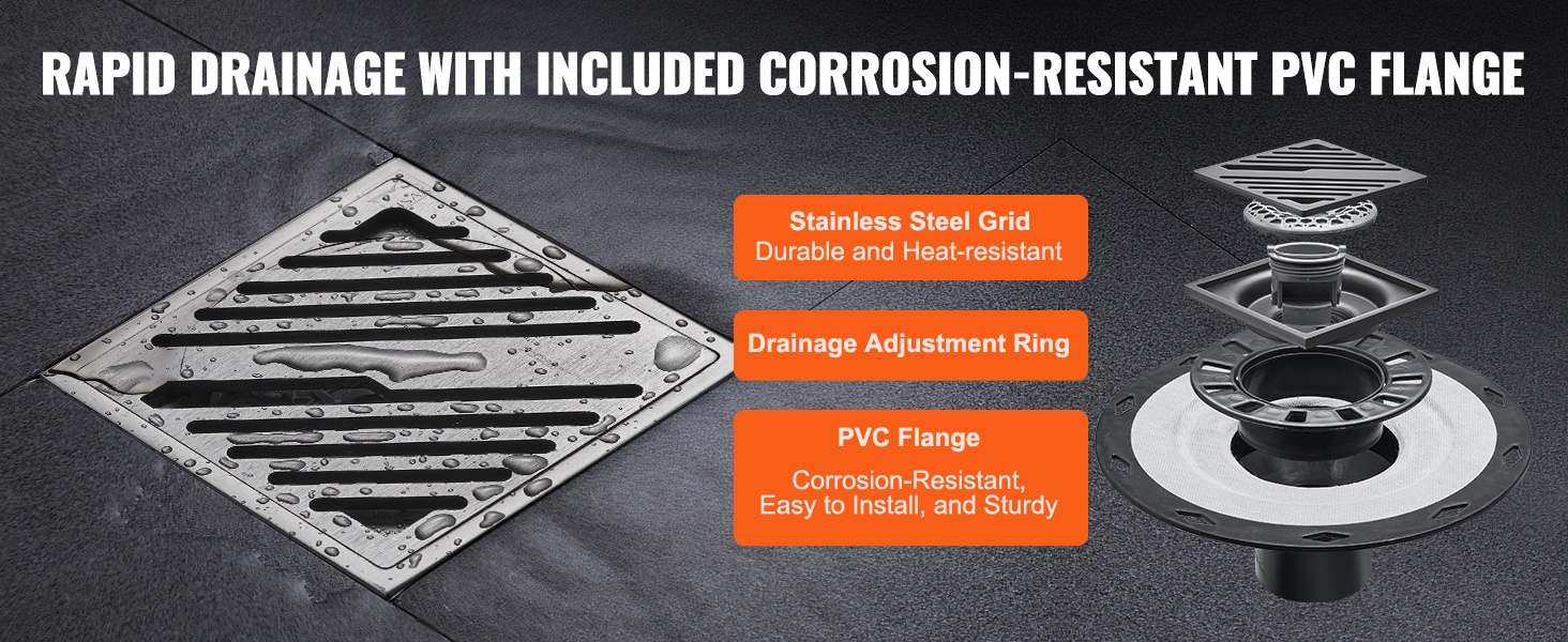 304-ruostumattomasta teräksestä valmistettu lattiakaivon ritilä kestää hyvin painetta ja kitkaa normaalissa kävelyssä ja seisomisessa. PVC-materiaalista valmistettu laippa on tukeva ja kestävä, ja se täyttää tiukat vaatimukset vedeneristyksen luotettavuudelle.