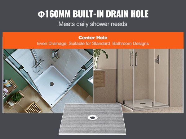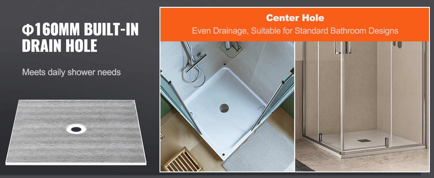 φ160mm:n keskelle sijoitettu viemäriaukko on suunniteltu takaamaan miellyttävän suihkukokemuksen. Ammattimaisesti toteutettu vedenpoistorakenne varmistaa tasaisen veden virtauksen ja täyttää päivittäiset suihkutarpeet, lisäten käyttömukavuutta kylpyhuoneessa.
