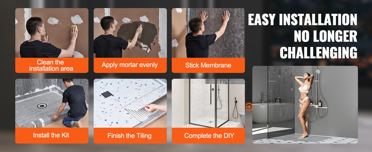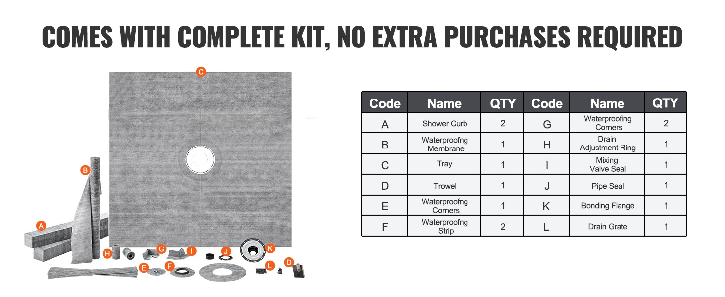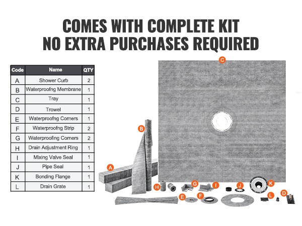 Tämä suihkualtaan asennuspakkaus sisältää valmiiksi kaltevan suihkun pohjalevyn, vesitiiviin kynnyksen, keskelle sijoitetun viemärilaipan, vedenpitävän kalvon, liitosnauhat, sisä- ja ulkokulmalistat sekä ruostumattomasta teräksestä valmistetun ritilän ja tiivistysmassan. Paketti helpottaa kylpyhuoneen suihkutilan rakentamista ja varmistaa luotettavan vedeneristyksen.