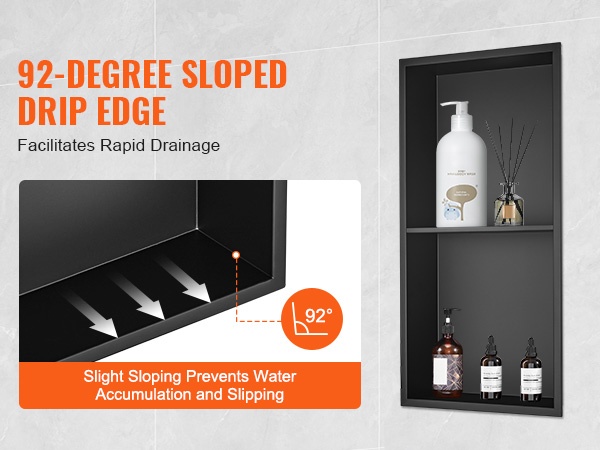 92° sisäkulma ja loiva kaltevuus ohjaavat veden nopeasti pois pinnalta. Tämä auttaa pitämään veden virtauksen tasaisena ja ehkäisee liukkaita kohtia suihkualueella.