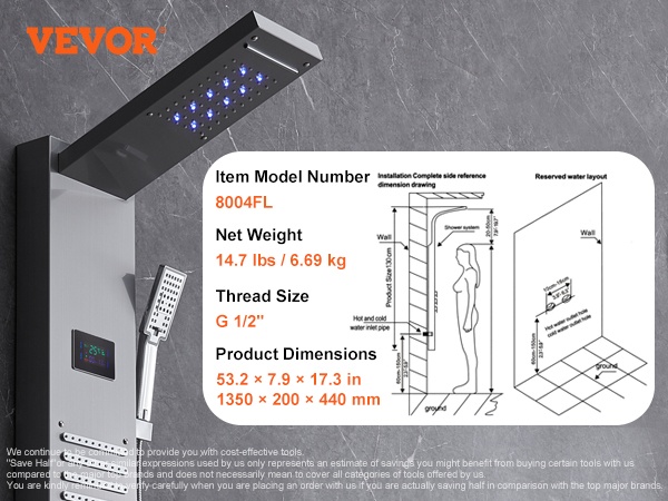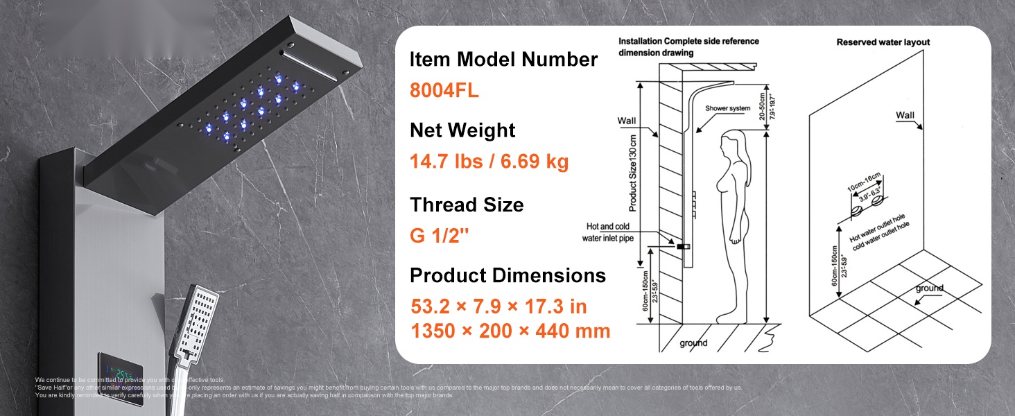 G 1/2" kierreliitäntä takaa hyvän veden tuoton ja vakaan paineen. Suihkupaneeli voidaan liittää useimpiin kylpyhuoneiden putkistoihin ilman erillisiä sovittimia.