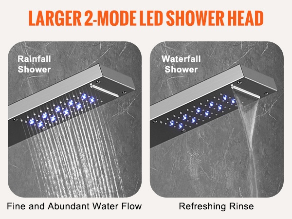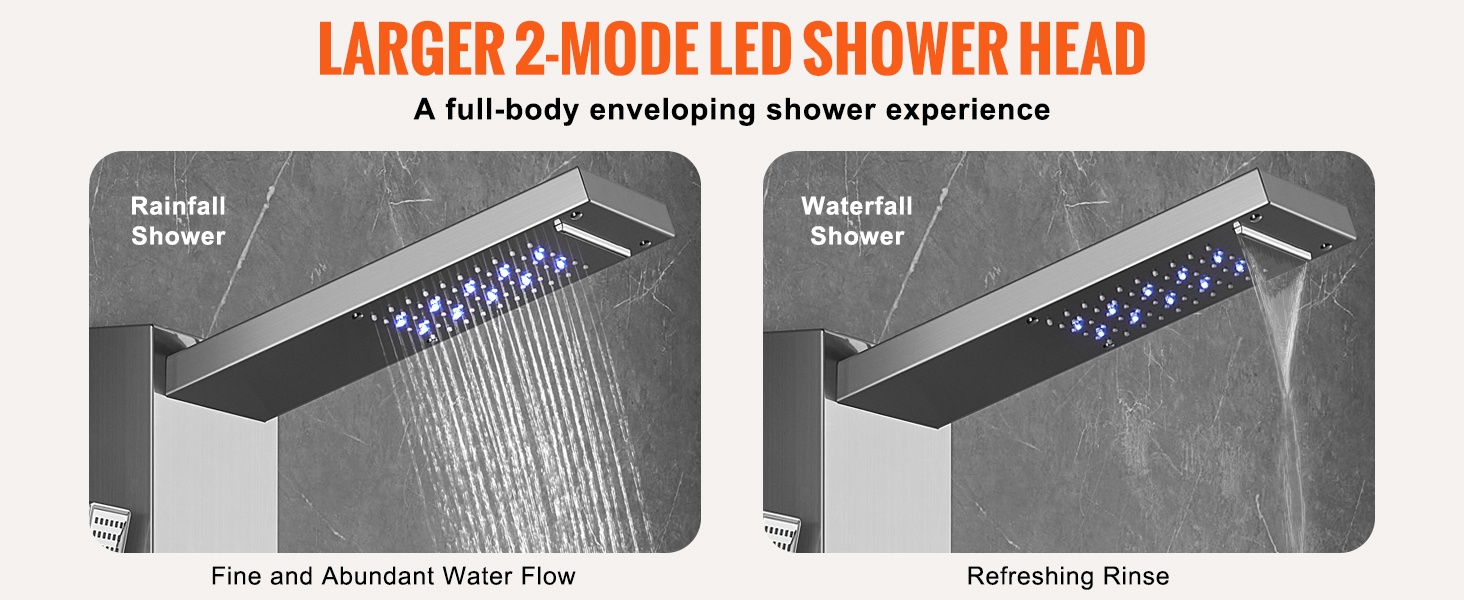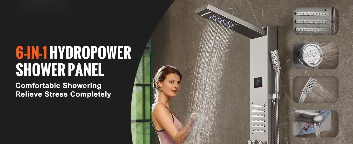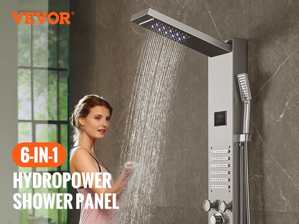 Tämä seinään asennettava suihkupaneeli tarjoaa 6 erilaista suihkutoimintoa, joiden avulla voit mukauttaa peseytymisen mielesi ja tarpeidesi mukaan. Yhdessä paneelissa on yläsuihku (sade ja vesiputous), 4 vartalohierontasuutinta, kaadonhana sekä käsisuihku 59 in/1,5 m letkulla.