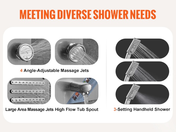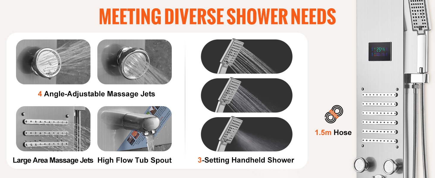 Vartalohierontasuihkut on suunniteltu siten, etteivät ne kohdistu suoraan kasvoihin. Eri kokoiset suuttimet tarjoavat joustavan hierontakokemuksen. Käsisuihkussa on 3 asentoa ja 59 in/1,5 m pituinen letku, joka sopii sekä suihkussa käyntiin, kylpyhuoneen puhdistamiseen että lemmikkien pesuun.