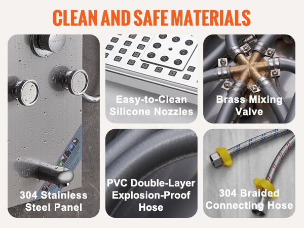 Paksunnettu 304-ruostumattomasta teräksestä valmistettu paneeli on kestävä, hygieeninen, korroosionkestävä ja helppo pitää puhtaana. Messinkinen sekoitusventtiili, PVC-kaksoisrikkoutumissuojattu putki ja 304-ruostumattomasta teräksestä punottu liitäntä muodostavat tukevan ja vuotamattoman järjestelmän.