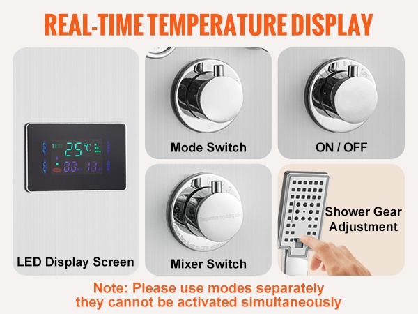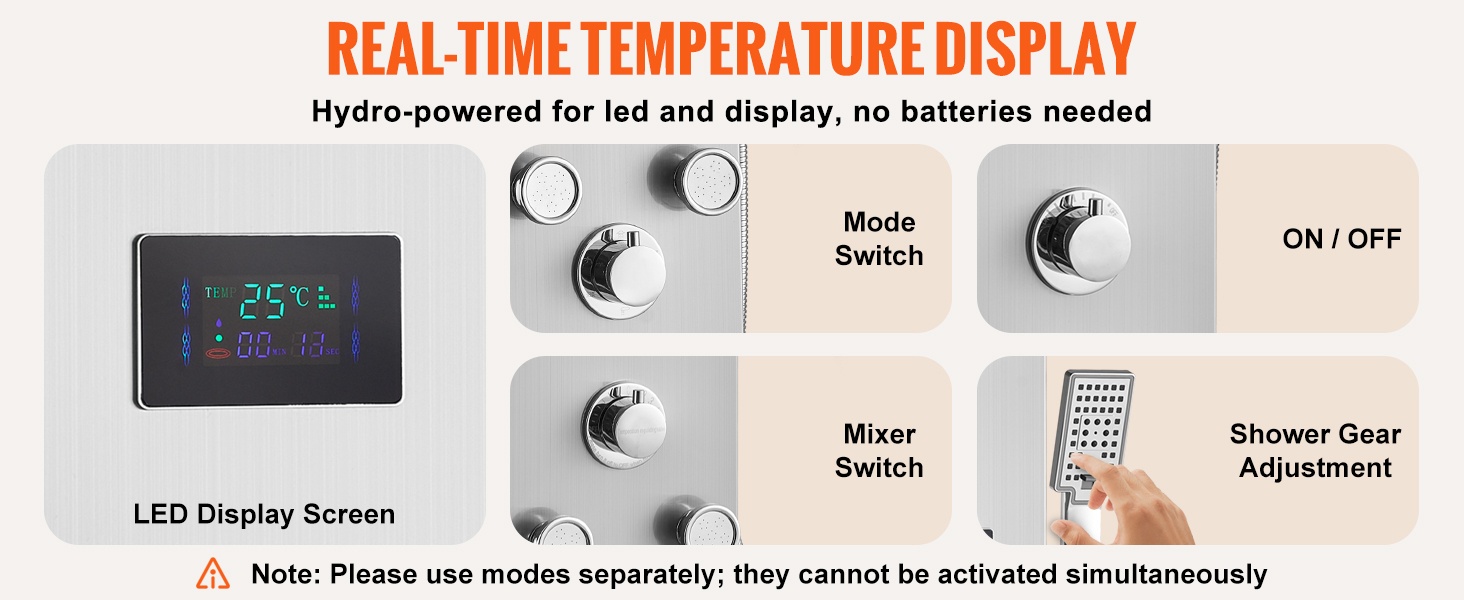 Suihkupaneelissa on digitaalinen näyttö sekä LED-valot, jotka helpottavat veden lämpötilan seurantaa ja tuovat miellyttävää tunnelmaa peseytymiseen.
