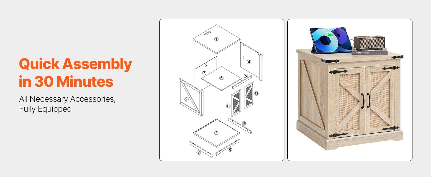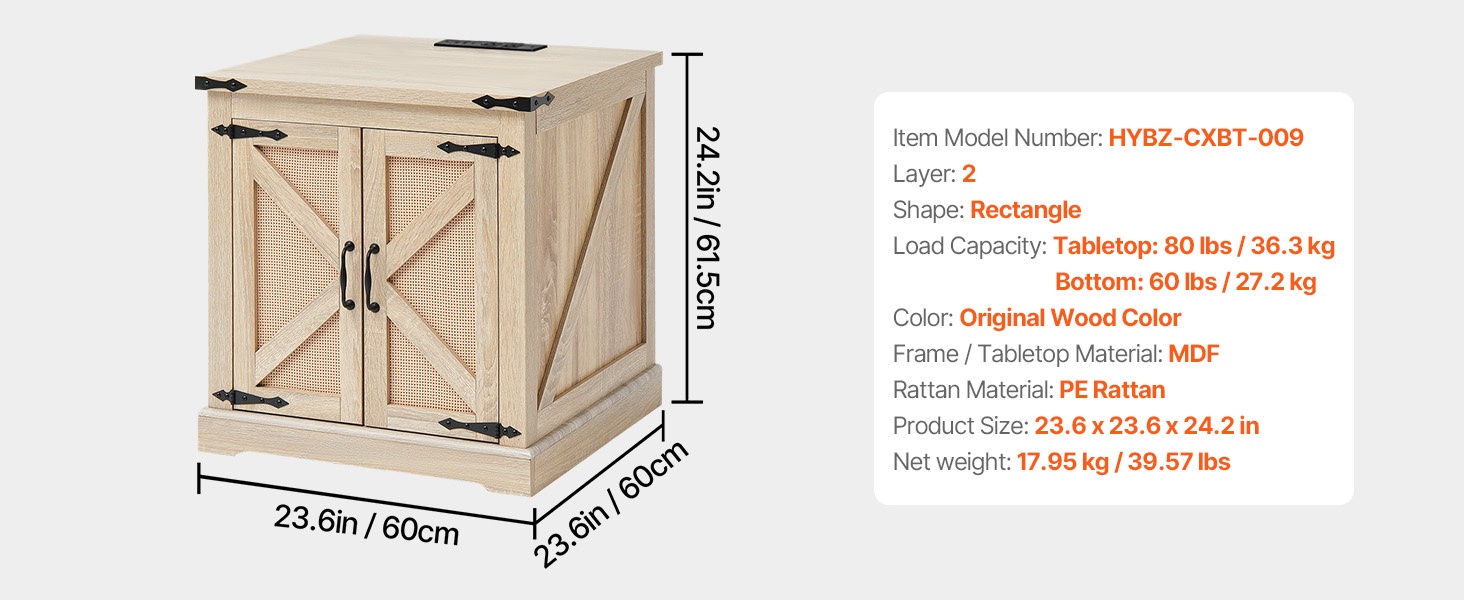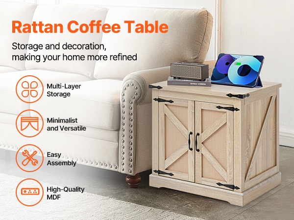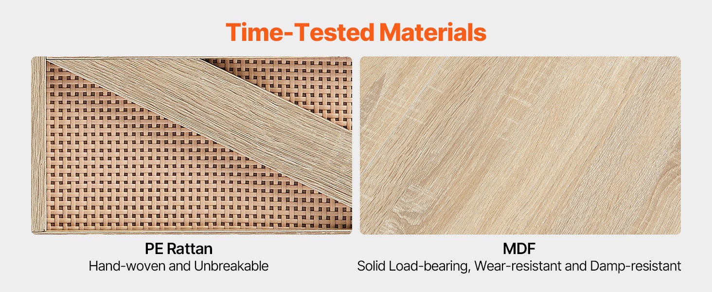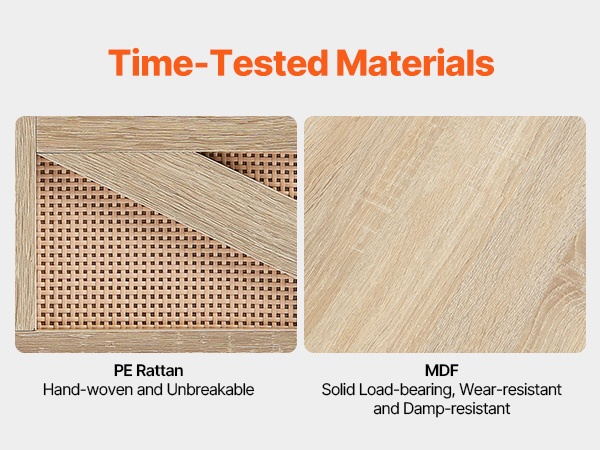 Pöydän runko ja kansi on valmistettu MDF-levystä, ja ulkopinta on punottua PE-rottinkia. Kansi kestää enintään 80 lbs / 36.3 kg ja alempi taso 60 lbs / 27.2 kg, joten pöytä soveltuu hyvin päivittäiseen käyttöön olohuoneessa, makuuhuoneessa tai pienissä tiloissa.