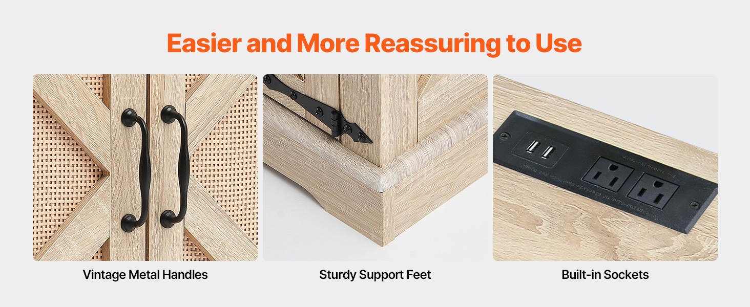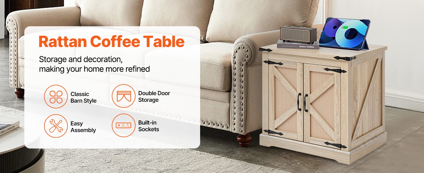 Tämä suorakulmainen rottinkipöytä yhdistää maatilatyylisen ilmeen mustiin metalliyksityiskohtiin ja tarjoaa käytännöllistä säilytystilaa pieniin ja suuriin tiloihin. Pöydässä on sisäänrakennettu pistorasia helppoa lataamista varten sekä kahteen suuntaan avautuva kansi, jonka alle mahtuvat arjen tavarat siististi piiloon.