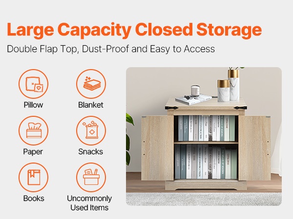 - Kaksiosainen, ylös kääntyvä kansi helpottaa vilttien, tyynyjen ja muiden tavaroiden säilytystä
