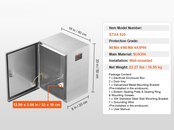 Tämä seinäkiinnitteinen sähkökotelo on valmistettu korkealaatuisesta SUS304-ruostumattomasta teräksestä ja sen suojausluokka on IP66. Kotelo suojaa laitteita korroosiolta, pölyltä ja vedeltä sekä sisä- että ulkokäytössä. Se sopii matalajännitejakeluun esimerkiksi asuin-, teollisuus-, liike- ja maatalouskäytössä.