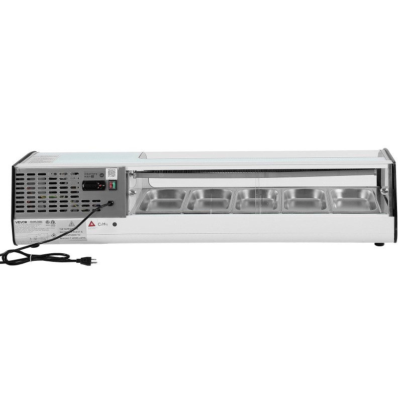 Tämä sushinäyttökaappi tarjoaa 52 L tilavuuden ja sisältää 5 kpl 1/3 GN -ruostumattomasta teräksestä valmistettuja astioita. Lämpötila-alue on 35.6–46.4℉ (2–8℃), kaareva karkaistu lasi ja LED-valaistus takaavat selkeän tuotenäkyvyyden, ja takapuolen liukuovet helpottavat käyttöä sushibaareissa, ravintoloissa ja myymälöissä.
