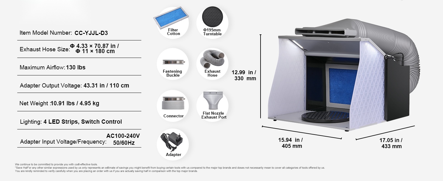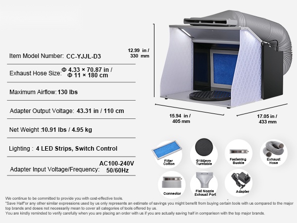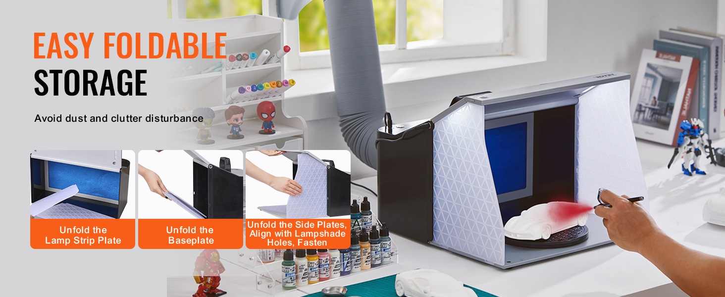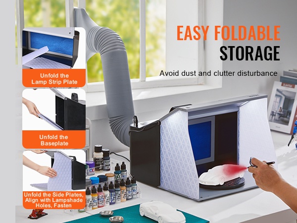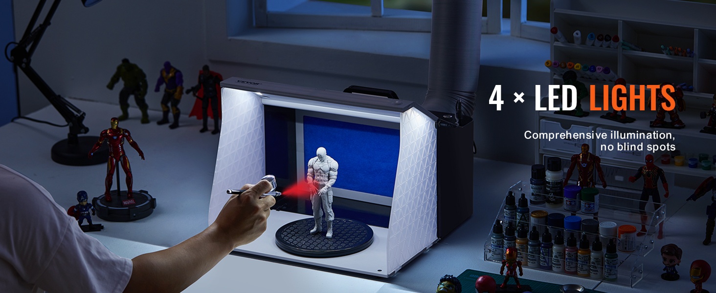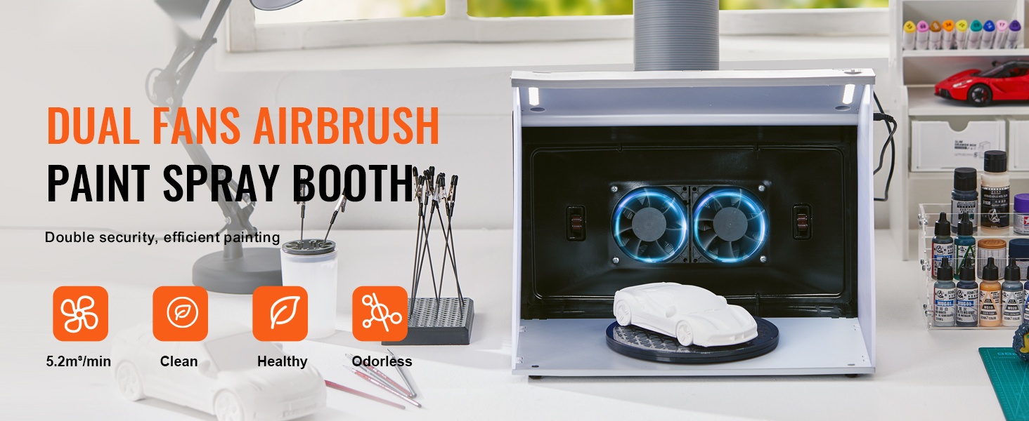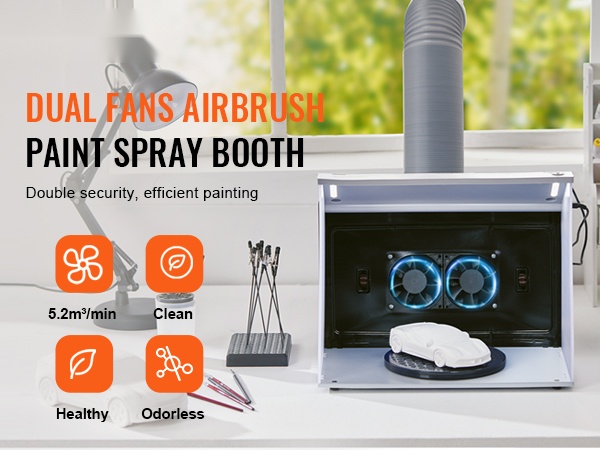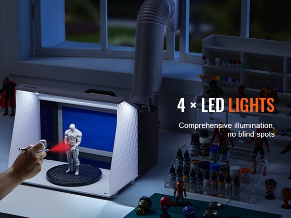 Tämä kannettava ilmasivellinsuihkutuskoppi tarjoaa puhtaan ja valaistun työtilan pienoismallien, taideteosten, käsitöiden ja kakkujen maalaamiseen. Kaksinkertaiset puhaltimet, tehokas poistoletku ja kääntöalusta auttavat pitämään sumun hallinnassa ja työnjäljen tarkkana, myös pienissä tiloissa.