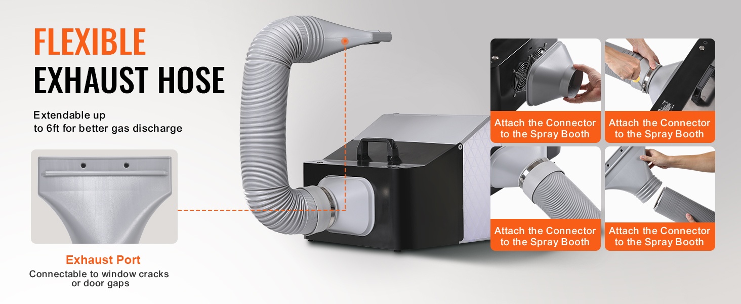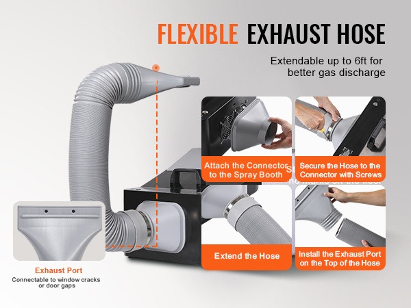 - Joustava poistoletku, joka ulottuu jopa 6 jalkaa, johtaa höyryt ja maalisumun tehokkaasti ulos.
