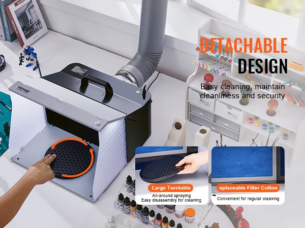 Suuri kääntöalusta helpottaa työkappaleen kääntämistä ja tarkastelua eri kulmista. Alusta on irrotettava puhdistusta varten, ja vaihdettava suodatin auttaa pitämään maalausympäristön siistinä.