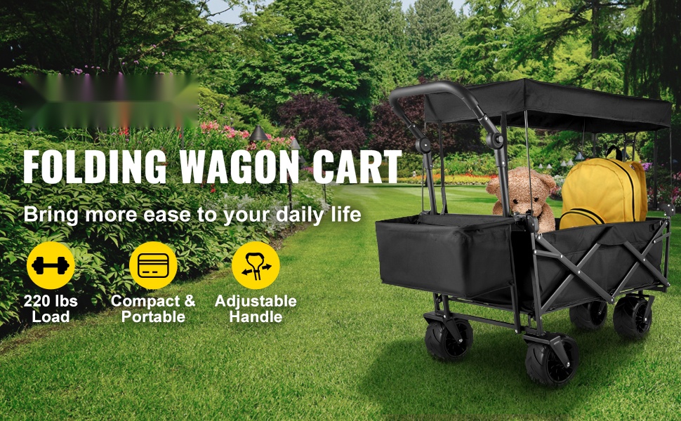 Taitettava kangasvaunu katoksella helpottaa tavaroiden kuljettamista rannalle, piknikille, puutarhaan tai tapahtumiin. Vahva teräsrunko, suuri sisätila ja jopa 220 LBS / 100 kg kantokyky tekevät vaunusta monikäyttöisen arjen apurin. Taittuva rakenne helpottaa säilytystä, ja säädettävät työntö- ja vetokahvat helpottavat ohjaamista erilaisilla alustoilla.