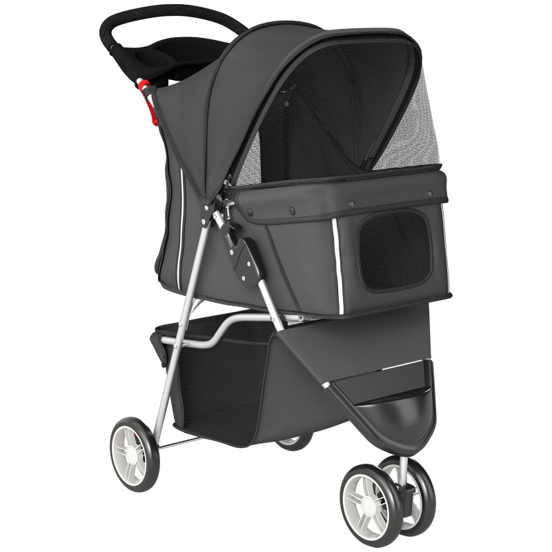 Taitettava lemmikkiratas pienille koirille ja kissoille, max 10 kg, säilytyskori, tummanharmaa