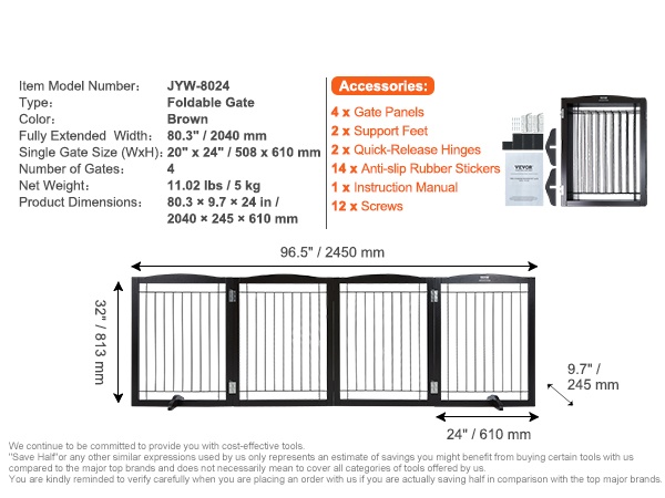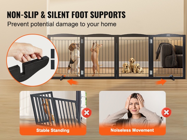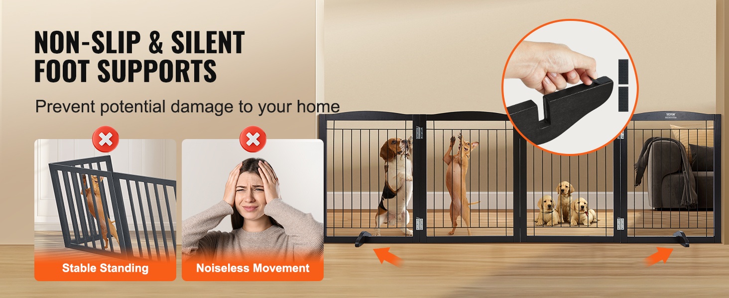 Puisessa koiraportissa on kaksi liukumatonta tukijalkaa, jotka pitävät portin tukevasti pystyssä eri asennoissa ja pienentävät kaatumisriskiä. Hiljaiset jalkatyynyt suojaavat lattiaa ja vähentävät ääntä porttia siirrettäessä.
