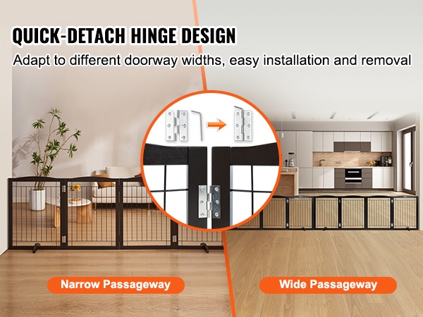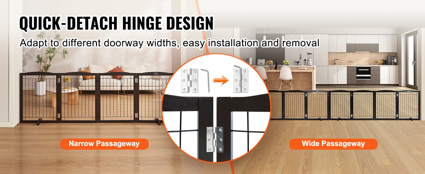 Portin paneelit on yhdistetty pikalukitteisilla saranaliitoksilla, joiden ansiosta leveyttä on helppo säätää eri tiloihin. Portti sopii sekä leveisiin oviaukkoihin että kapeisiin käytäviin, ja sitä voi siirtää joustavasti huoneesta toiseen tarpeen mukaan.